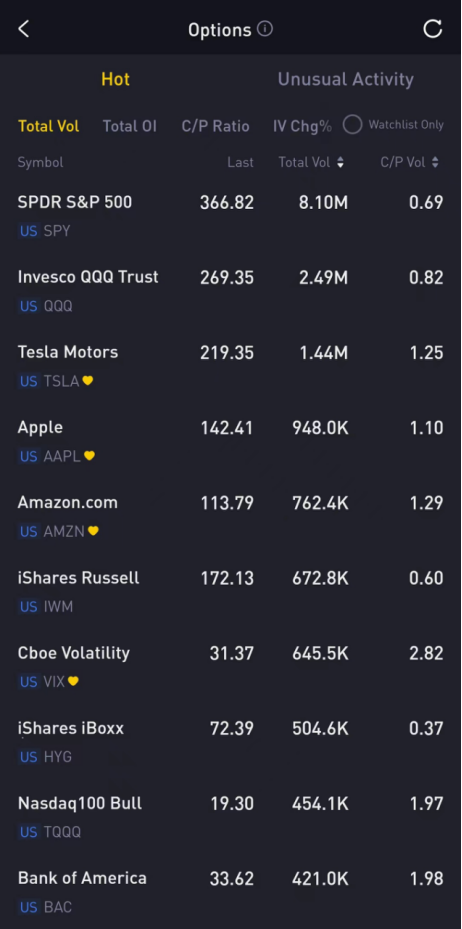 Top 10: SPY, QQQ, TSLA, AAPL, AMZN, IWM, VIX, HYG, TQQQ, BAC