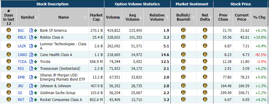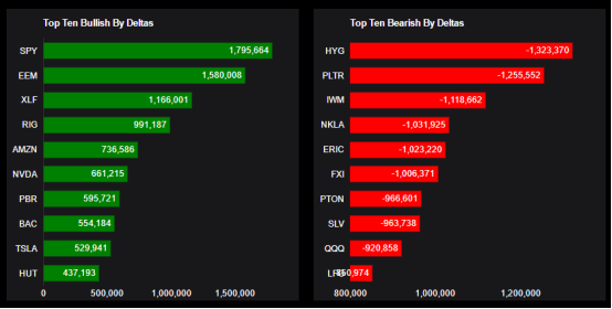 This report shows stocks with the highest volume of bullish and bearish activity by option delta volume, which converts option volume to an equivalent stock volume (bought or sold).