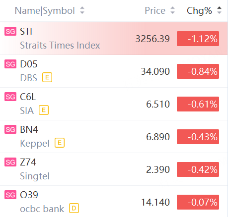 Singapore stocks opened lower on Thursday. STI fell 1.12%, DBS bank fell 0.84%, SIA fell 0.61%, Keppel fell 0.43%, Singtel fell 0.42%.