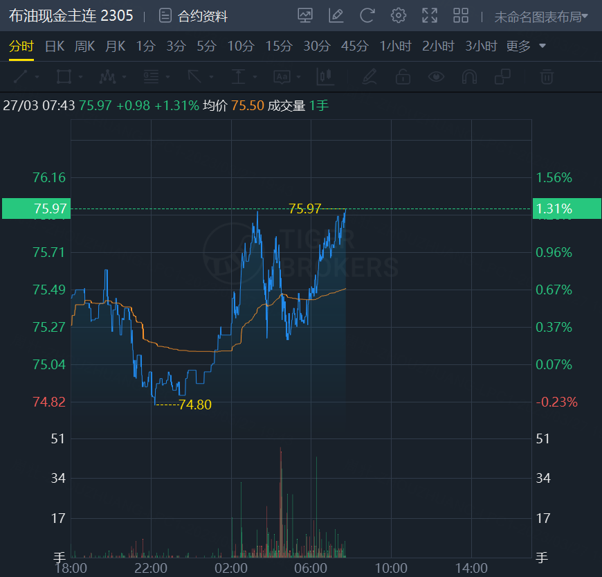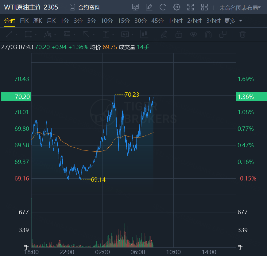 原油期货震荡走高,截止发稿,WTI原油涨1.36%,报70.2美元/桶;布伦特原油涨1.31%,报75.97美元/桶。