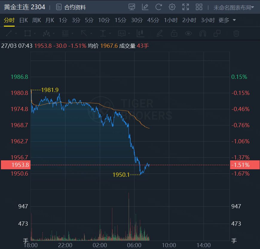 黄金期货日内走低,截止发稿,跌1.51%,报1953.8美元/盎司。