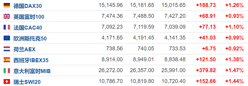 欧洲主要股指全线上涨,截至发稿,德国DAX30指数涨1.26%,英国富时100涨0.93%,法国CAC40涨1.1%。