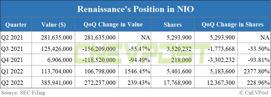 Renaissance's holdings in NIO were worth about $386 million, up 239.43 percent from $114 million at the end of the first quarter.