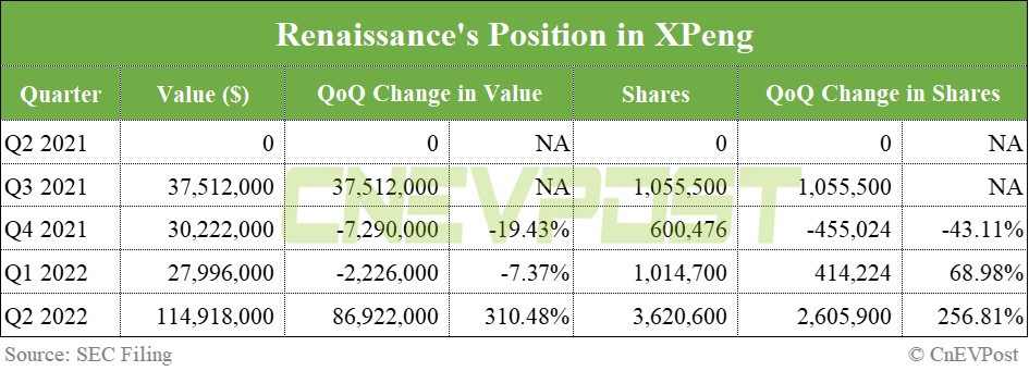 Renaissance also significantly increased its position in XPeng in the second quarter, holding 3,620,600 shares at the end of the second quarter, up 2,605,900 shares, or 256.81 percent, from 1,014,700 shares at the end of the first quarter.
