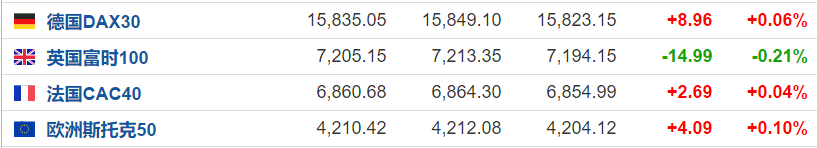 欧洲主要指数上涨,德国DAX30涨0.06%,英国富时100跌0.21%,法国CAC40涨0.04%,欧洲斯托克50涨0.1%。
