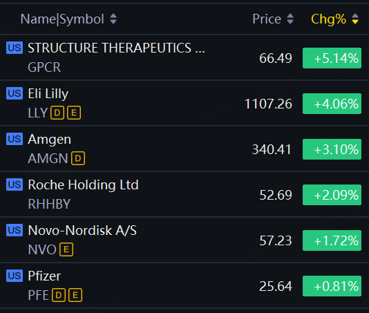 Weight-loss drugmakers' stocks jumped on Wednesday. Structure Therapeutics up 5%; Eli Lilly rose 4% to record high; Amgen up 3%; Roche, Novo up around 2%.