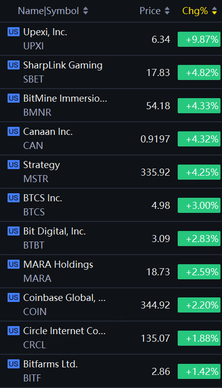 Crypto shares jumped on Wednesday as Bitcoin topped $116K, Ethereum rallied above $4,300. Upexi up 10%; SBET up nearly 5%; BitMine, Strategy up over 4%; BTCS, Bit Digital up over 3%.