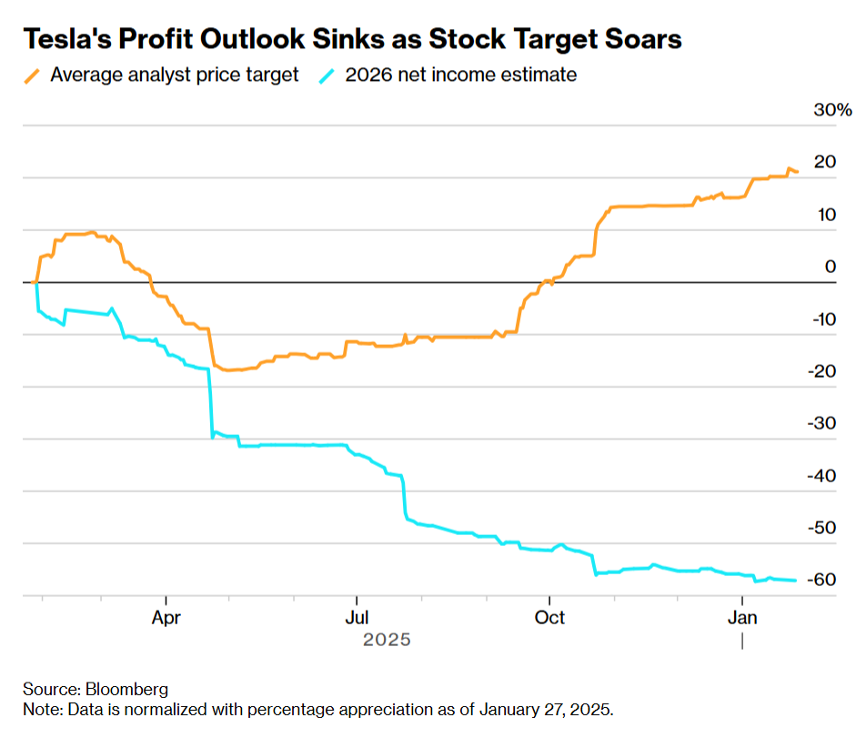 What makes Tesla even more of an outlier is that while every other member of the Magnificent Seven has seen price targets rise over the past year, Tesla alone has experienced a simultaneous deterioration in profit expectations.