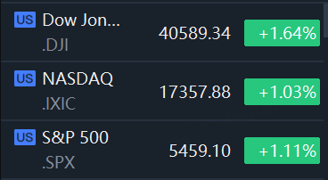 The S&P 500 gained 59.88 points, or 1.11%, at 5,459.10 points, while the Nasdaq Composite climbed 176.16 points, or 1.03%, to 17,357.88. The Dow Jones Industrial Average rose 654.27 points, or 1.64%, to 40,589.34.