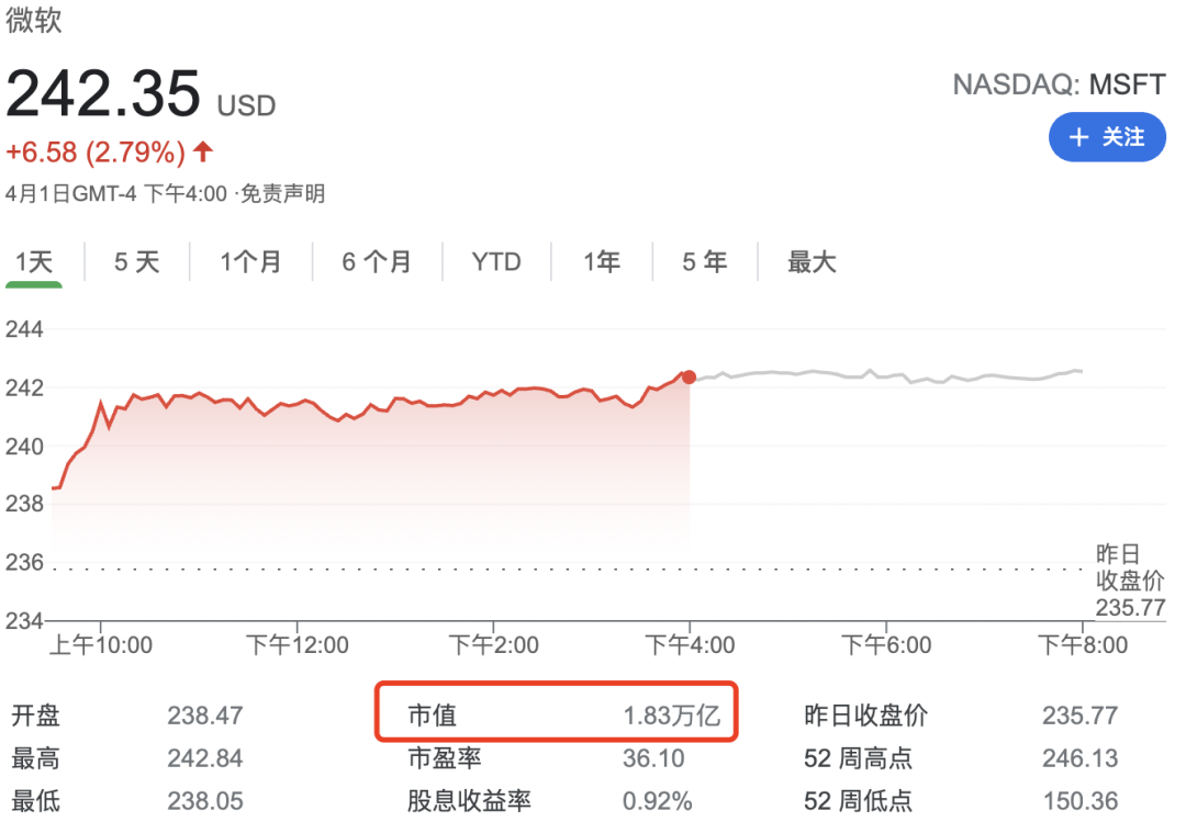 到现在,微软市值已经达1.83万亿美元。