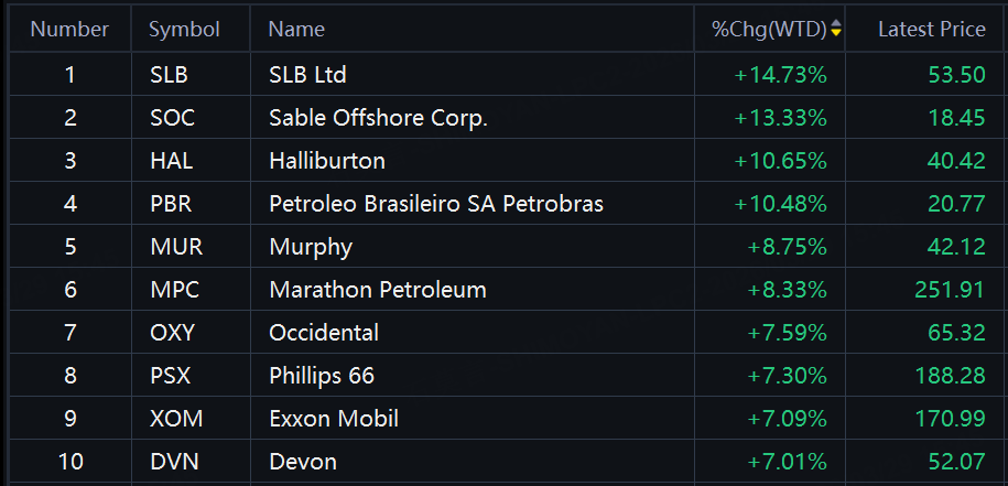 SLB rose 14.73% for the week; Sable Offshore up over 13%; Halliburton, Petroleo Brasileiro SA Petrobras up over 10%; Marathon Petroleum up over 8%; Occidental, Exxon Mobil up over 7%.