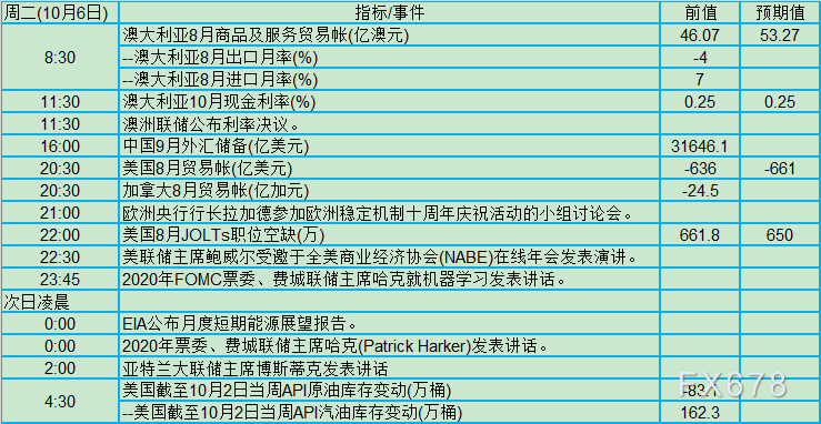 周二(10月6日)关键词:澳洲联储决议、中国外储、拉加德、API澳洲联储10月份可能选择维持关键利率在创纪录低位0.25%,但多数人预计澳洲联储将在11月降息。澳洲联储近期强调了财政刺激的重要性,并有可能对将在10月6日到期的联邦预算措施给出评估。