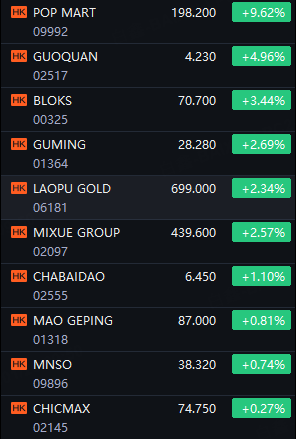 HK new consumption stocks shined. Pop Mart up 10%; Guoquan up 5%; Bloks up 3%; Guming, Laopu Gold and Mixue up 2%.