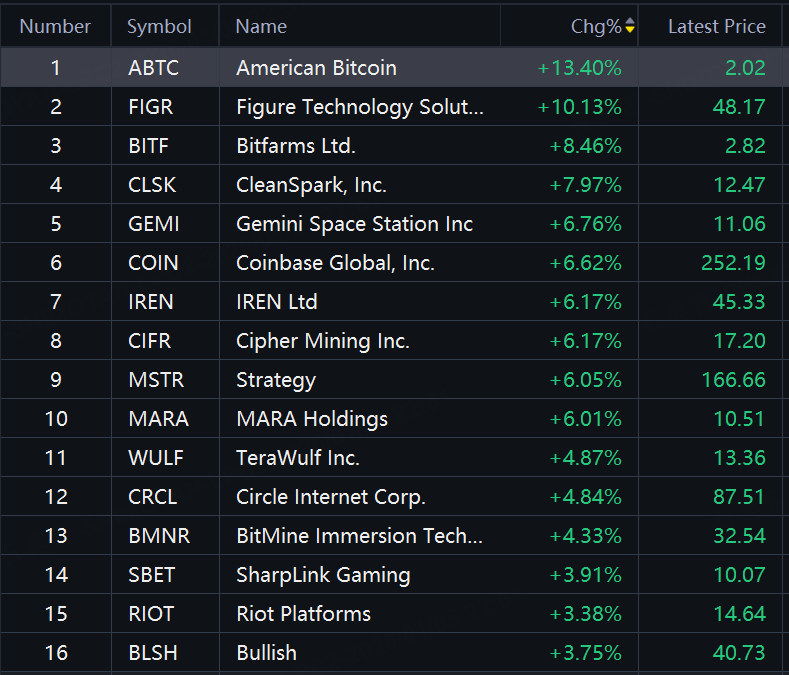 American Bitcoin up over 13%; Figure up 10%; Bitfarms, CleanSpark up about 8%; GEMI up 7%; Coinbase up over 6%.