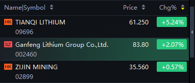 HK Movers | Lithium Mining Stocks Rise; Tianqi Lithium up 5%; Ganfeng Lithium up 2%