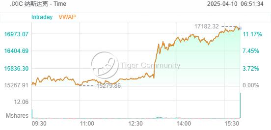 美股全线大涨,纳斯达克指数涨超12%,标普500指数涨9.5%,道琼斯工业指数涨近8%。特斯拉涨超22%,英伟达涨超18%,苹果涨逾15%。