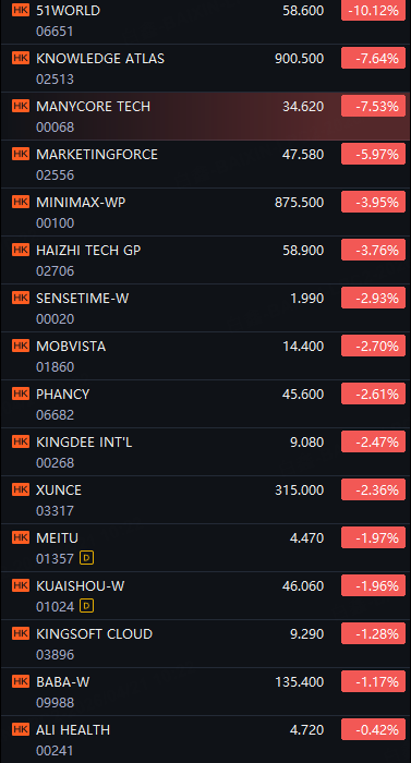 HK AI App Stocks Tumbled. 51World Down 10%; Knowledge Atlas and Manycore down 7%; MarketingForce Down 6%; MiniMax and Haizhi Tech Down 4%; Sensetime and Mobvista Down 3%.