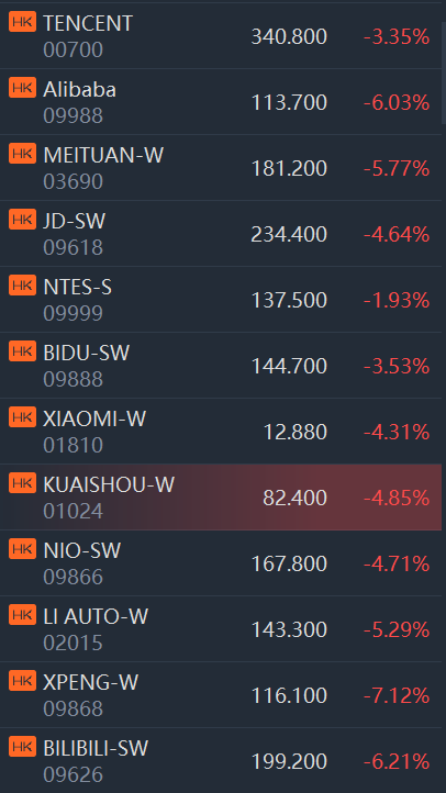 Shares of U.S.-listed Chinese companies were trading lower in Hong Kong on Monday, with major tech stocks like Alibaba Group Holdings,Tencent ,Baidu, and JD.com Inc slipping between 3% and 6%.