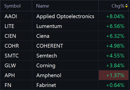 Optical communication stocks rallied in morning trading. Applied Optoelectronics rose 8%; Lumentum rose 7%; Ciena rose 6%; Coherent and Semtech rose 5%; Corning rose 4%.