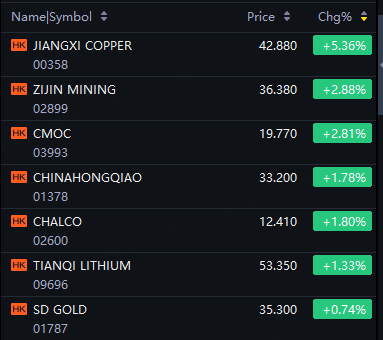 Jiangxi Copper rose 5%; Zijin Mining, CMOC rose 3%; CHALCO up 2%; Tianqi Lithium up 1%.