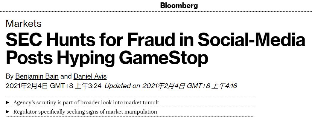 彭博 | 美国证券交易委员会调查推高GameStop的社交媒体帖子是否存在欺诈