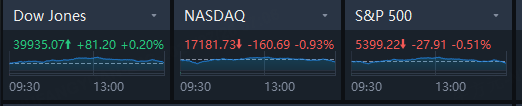 The S&P 500 lost 27.91 points, or 0.51%, at 5,399.22 points, while the Nasdaq Composite fell 160.69 points, or 0.93%, to 17,181.72. The Dow Jones Industrial Average rose 81.20 points, or 0.20%, to 39,935.07.