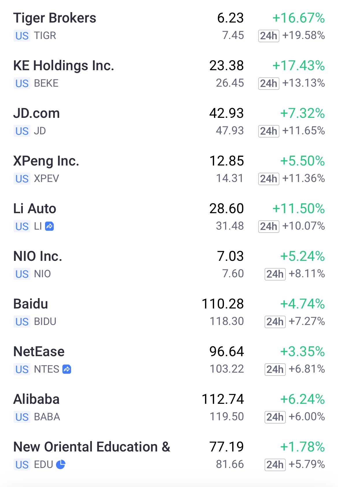 Tiger Brokers rose 20%; KE Holdings rose 13%; JD.com rose 12%; XPeng rose 11%; Li Auto rose 10%; NIO rose 8%; Alibaba, PDD Holdings rose 6%.