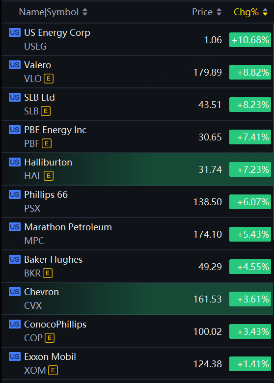 US Energy up over 10%; Valero, SLB Ltd up over 8%; PBF Energy, Halliburton up over 7%; Phillips 66 up 6%.