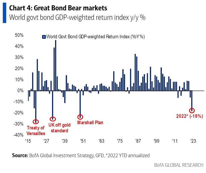 不过,根据美银汇编的数据,美国政府债券的回报率可能将创下自1949年马歇尔计划实施一年后以来的最差纪录,第三次债券大熊市正在进行。美银首席投资策略师Michael Hartnett指出,负收益率债券已悄然消失,从约18万亿美元降至不到2万亿美元。