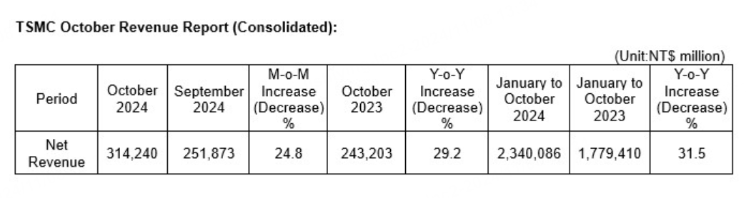 TSMCtoday announced its net revenue for October 2024: On a consolidated basis, revenue for October 2024 was approximately NT$314.24 billion, an increase of 24.8 percent from September 2024 and an increase of 29.2 percent from October 2023. Revenue for January through October 2024 totaled NT$2,340.09 billion, an increase of 31.5 percent compared to the same period in 2023.