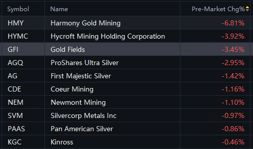 Harmony Gold down 7%; Hycroft Mining down 4%; Gold Fields, AGQ down 3%; First Majestic Silver, Newmont, Coeur Mining down 1%.