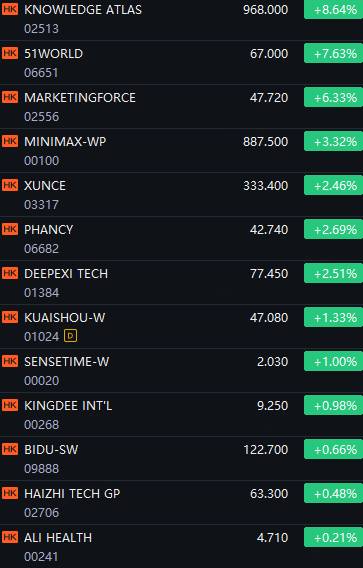 HK AI App Stocks Shined. Knowledge Atlas up 9%; 51World up 8%; MarketingForce up 6%; MiniMax up 3%; Xunce, Phancy and DeepXi up 2%.
