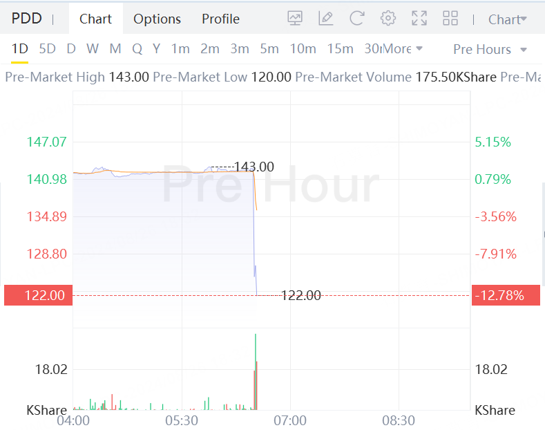 China's PDD Holdings missed market estimates for quarterly revenue on Monday, as frail consumer spending dented business at its domestic e-commerce platform Pinduoduo, sending the company's shares down nearly 13% in premarket trading.