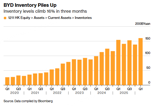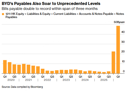 BYD also saw a surge in bills payable, which doubled to 48.6 billion yuan as of the end of March. Like the short-term borrowings, those rose to all-time highs for the company, according to public data compiled by Bloomberg.