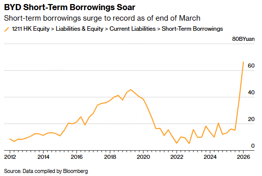Short-term borrowings jumped 72% within three months to 66.3 billion yuan ($9.7 billion) by the end of March, according to the Shenzhen-based carmaker’s financial results released Tuesday. That’s as quarterly profit tumbled 55% to its lowest level in more than three years.