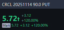 A total number of 373,613 options related to Circle were traded on Wednesday, up 120% from the previous trading day, of which call options accounted for 55%. Particularly high volume was seen for the $90 strike put option expiring Nov. 14, with 23,154 contracts trading. $CRCL 20251114 90.0 PUT$