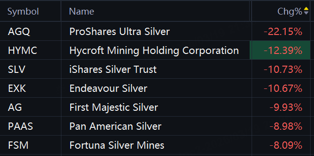 Gold, silver stocks and ETFs sank in morning trading. ProShares Ultra Silver fell 22%; Hycroft Mining and ProShares Ultra Gold fell 12%; iShares Silver Trust and Endeavour Silver fell 11%; First Majestic Silver, Hecla Mining, and Anglogold Ashanti fell 10%; Pan American Silver and Eldorado fell 9%; Coeur Mining, Fortuna Silver Mines, Newmont Mining, Kinross, Gold Fields, and Agnico Eagle Mines fell 8%; Harmony Gold and Barrick Mining(B)$ fell 7%; SPDR Gold ETF and Gold Trust Ishares fell 6%.
