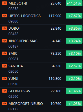 HK Robotic Stocks Shined. Medbot up 12%; Ubtech up 8%; Dobot, Jingcheng Mac and SMIC up 3%; Sanhua and Yunji up 2%.
