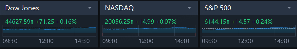 The Dow Jones Industrial Average rose 71.25 points, or 0.16%, to 44,627.59, the S&P 500 rose 14.57 points, or 0.24%, to 6,144.15 and the Nasdaq Composite rose 14.99 points, or 0.07%, to 20,056.25.