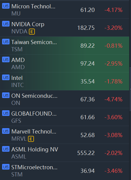 Semiconductor stocks slid in morning trading. Nvidia, Micron Technology, ASML, STM, AMD and ON Semiconductor fell between 1% and 4%.