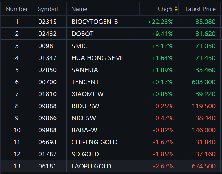 Biocytogen surged 22%; Dobot up over 9%; SMIC up over 3%; Hua Hong Semi, Sanhua up over 1%; Baidu, NIO, Alibaba down within 1%.