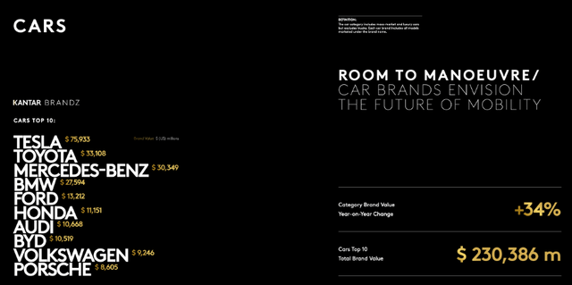 The company's eco-friendly mission has accelerated the value of Tesla's brand substantially, with Tesla now being the world's 29th most valuable brand according to Kantar BrandZ- notably, the highest rating for a car brand, with its closest competitor being Toyota, ranked 66th.