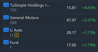 EV stocks rebounded in morning trading, with TuSimple rising nearly 5% and General Motors,Li rising around 2%.