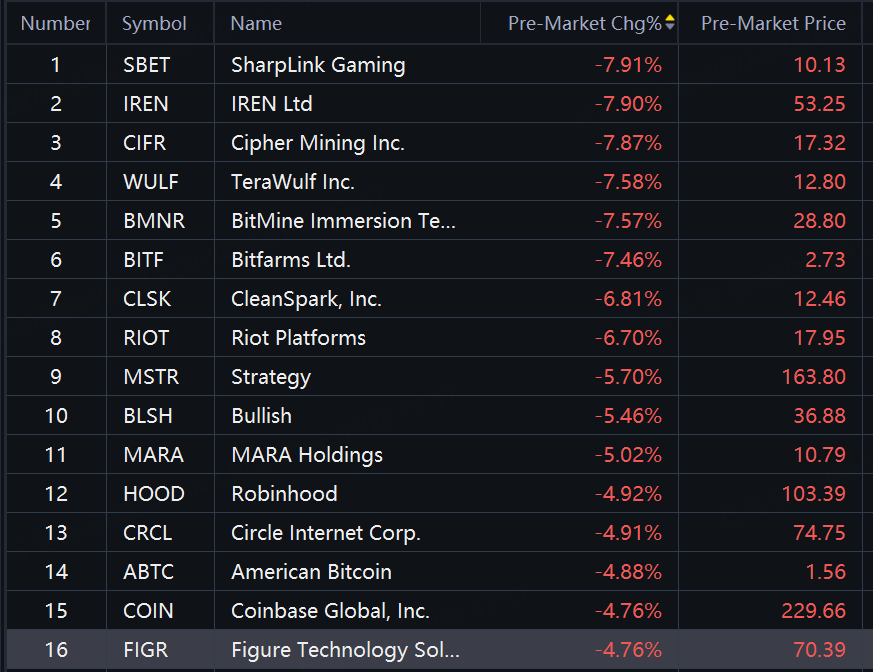 Crypto shares slid in premarket trading as Bitcoin dropped below $91,000 and Ethereum dropped to $3,130. SharpLink Gaming, Cipher Mining down about 8%; BitMine, CleanSpark down around 7%; MARA down 6%.