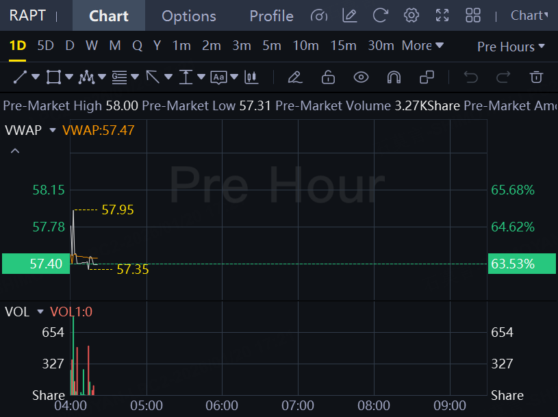 RAPT Therapeutics shares surged over 63% in premarket trading. Britain's GSK will buy RAPT Therapeutics for $2.2 billion, adding global rights to the U.S. firm's experimental food allergy drug ozureprubart to its respiratory and immunology portfolio, the drugmakers said on Tuesday.