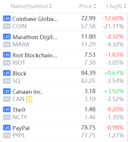 Crypto Stocks Fell in Premarket Trading, with Coinbase Stock Dropping over 21%.