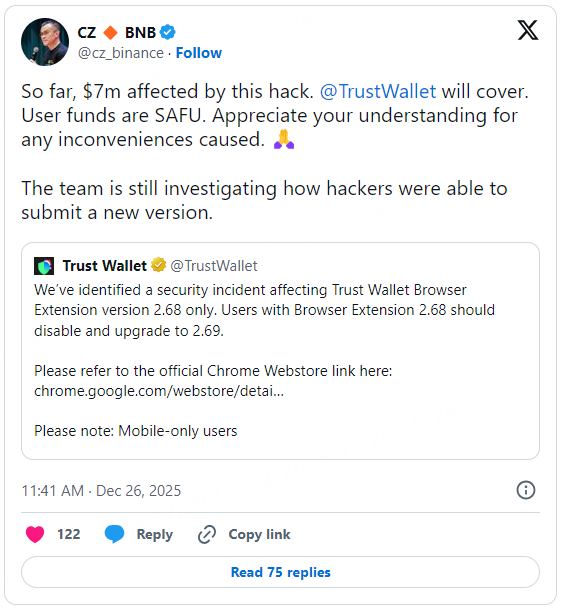 Trust Wallet, a cryptocurrency wallet owned by Binance founder Changpeng "CZ" Zhao, said on Thursday it had identified a security breach affecting a specific version of its browser extension, with Zhao confirming that at least $7 million was stolen and that the company will reimburse all affected users.