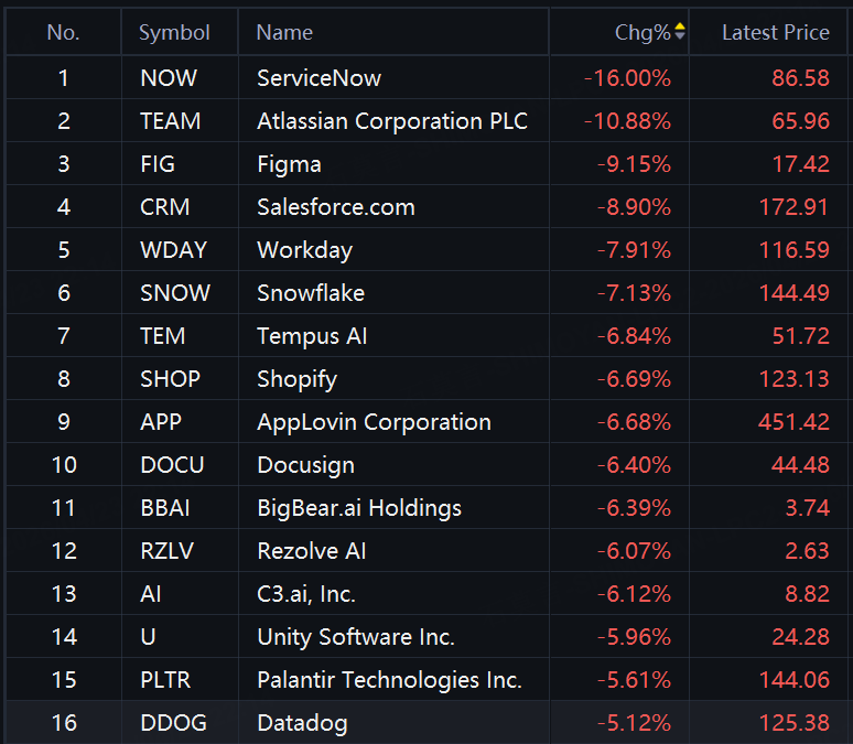 AI software shares slid on Thursday. ServiceNow down 16%; Atlassian down 11%; Figma down 9%; Workday down 8%; Snowflake, Tempus AI down around 7%.