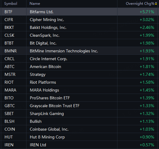 Bitfarms up 6%; Strategy, Circle, BMNR rose 2%; Coinbase, Bullish, SBET up 1%.