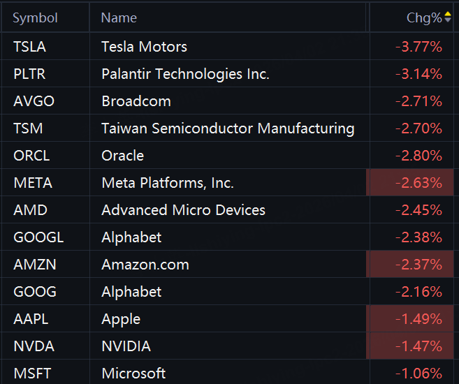 Tesla fell 4%; Palantir, Oracle, Broadcom, TSMC, Meta, and AMD fell 3%; Alphabet, Amazon, Apple, and Nvidia fell 2%; Microsoft fell 1%.